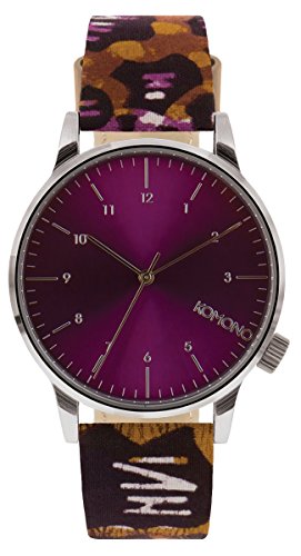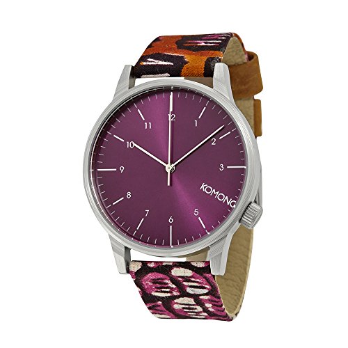 Studio : Komono Publisher : Komono Binding : Watch Product Description Silver-tone metal case with a snake-print fabric strap. Fixed silver-tone bezel. Purple dial with silver-tone hands and index and Arabic numeral hour markers. Minute markers around the outer rim. Dial Type: Analog. Quartz movement. Scratch resistant mineral crystal. Solid case back. Case diameter: 41 mm. Case thickness: 9 mm. Round case shape. Band width: 18 mm. Tang clasp. Water resistant at 30 meters / 100 feet. Functions: hour, minute, second. Casual watch style. Komono Winston Wilver Vlisco Purple Dial Snake Print Ladies Watch W2900. 0