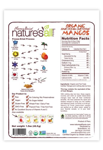 - Feature : 100% organic freeze-dried mangos / Healthy travel snacks perfect for kids' lunches / Lightly crunchy and mess-free / Kosher, raw, vegan, and certified fair trade / Gluten and GMO-free
