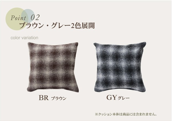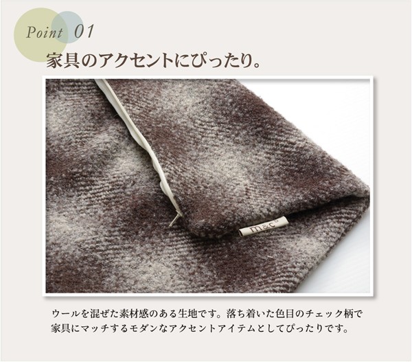 『シンプルでベーシックで素材感のある』をコンセプトにクッションカバーを作りました。ベーシックな色目のソファーに合わせやすい色にこだわりました。側地にはウールを混ぜ素材感を出しています。シンプルなチェック柄にもかかわらず、ちょっとお洒落なクッションとして、お部屋のイメージアップにお使い下さい。本商品はファスナータイプですので付け外しが簡単です。ご家庭の洗濯機で丸洗い可能なので清潔にご使用頂けます。