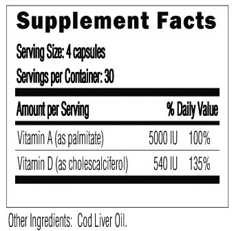 Supplement Facts: Serving Size: 4 capsules Servings per Container: 30 Amount per Serving % Daily Value Vitamin A (as palmitate) 5000 IU 100% Vitamin D (as cholescalciferol) 540 IU 135% Other Ingredients: Cod Liver Oil.