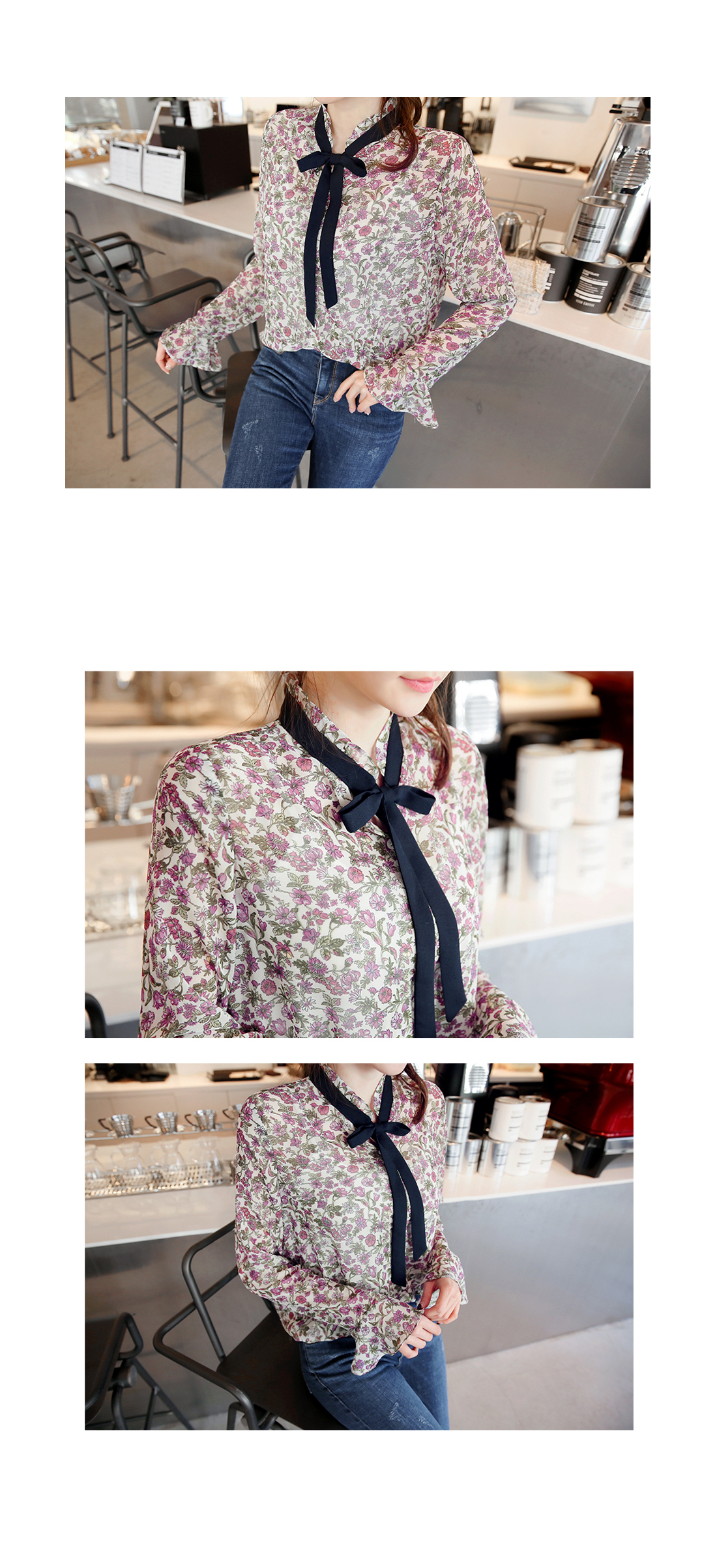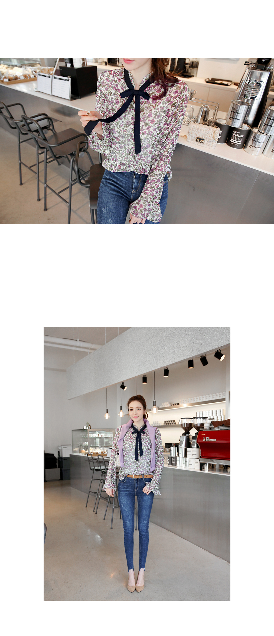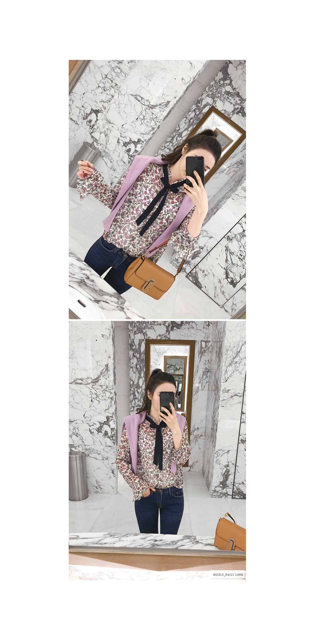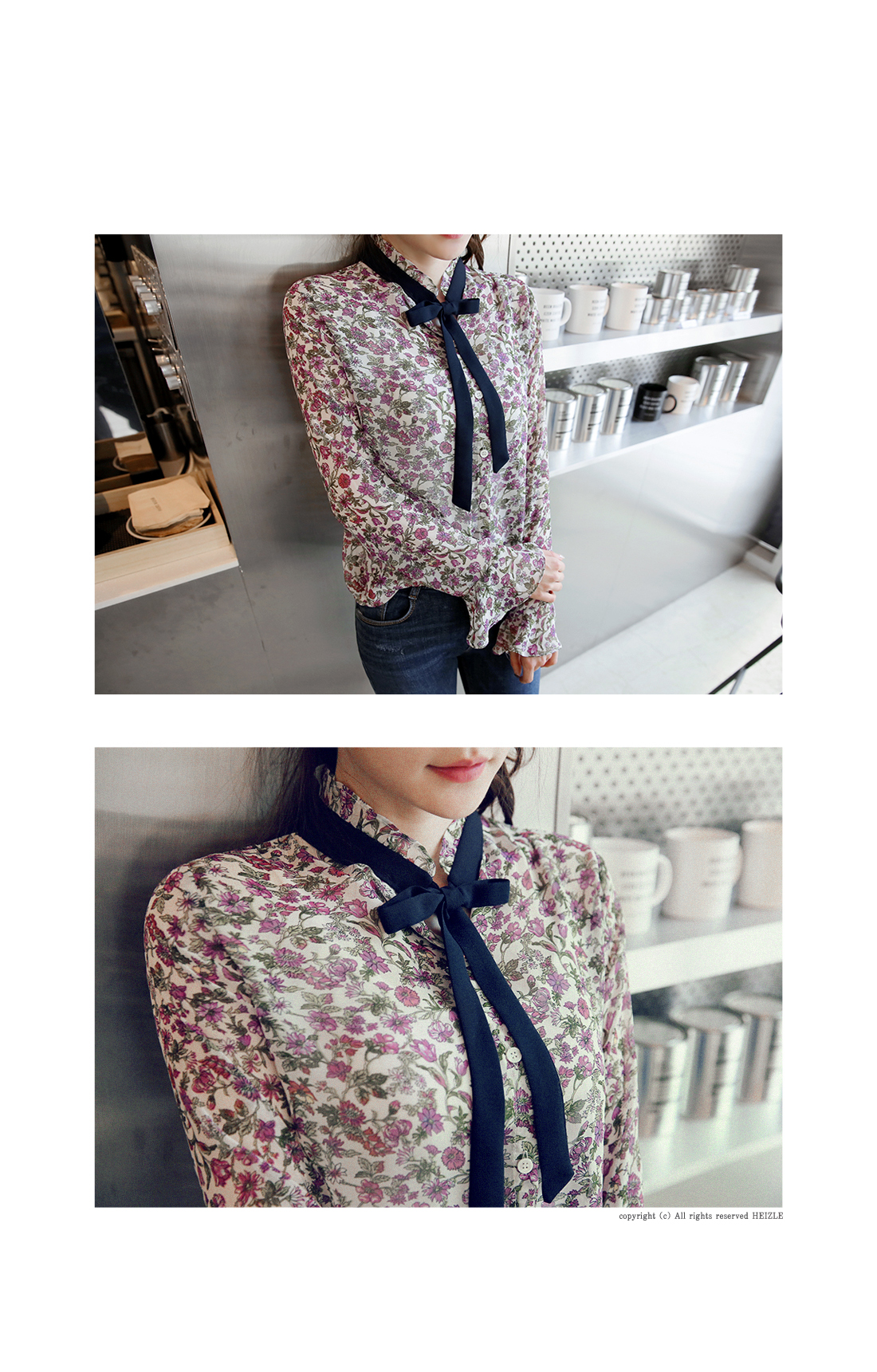 로맨틱한 무드의 쉬폰블라우에요! 은은한 플라워패턴과 소매 프릴이 로맨틱한 무드를 완성해 주구요 넥라인 리본끈이 포인트되어 한층 더 매력적인 룩을 완성해줘요~ 하늘하늘한 쉬폰 소재감으로 시즌에 상관없이 입을 수 있구요 과하지않은 스타일이라서 다양한 룩에 손쉽게 코디된답니다! 데님에는 물론 스커트에 매치하면 더욱 여성스럽게 연출할 수 있어요^^