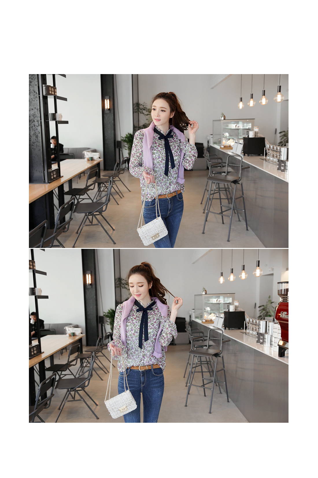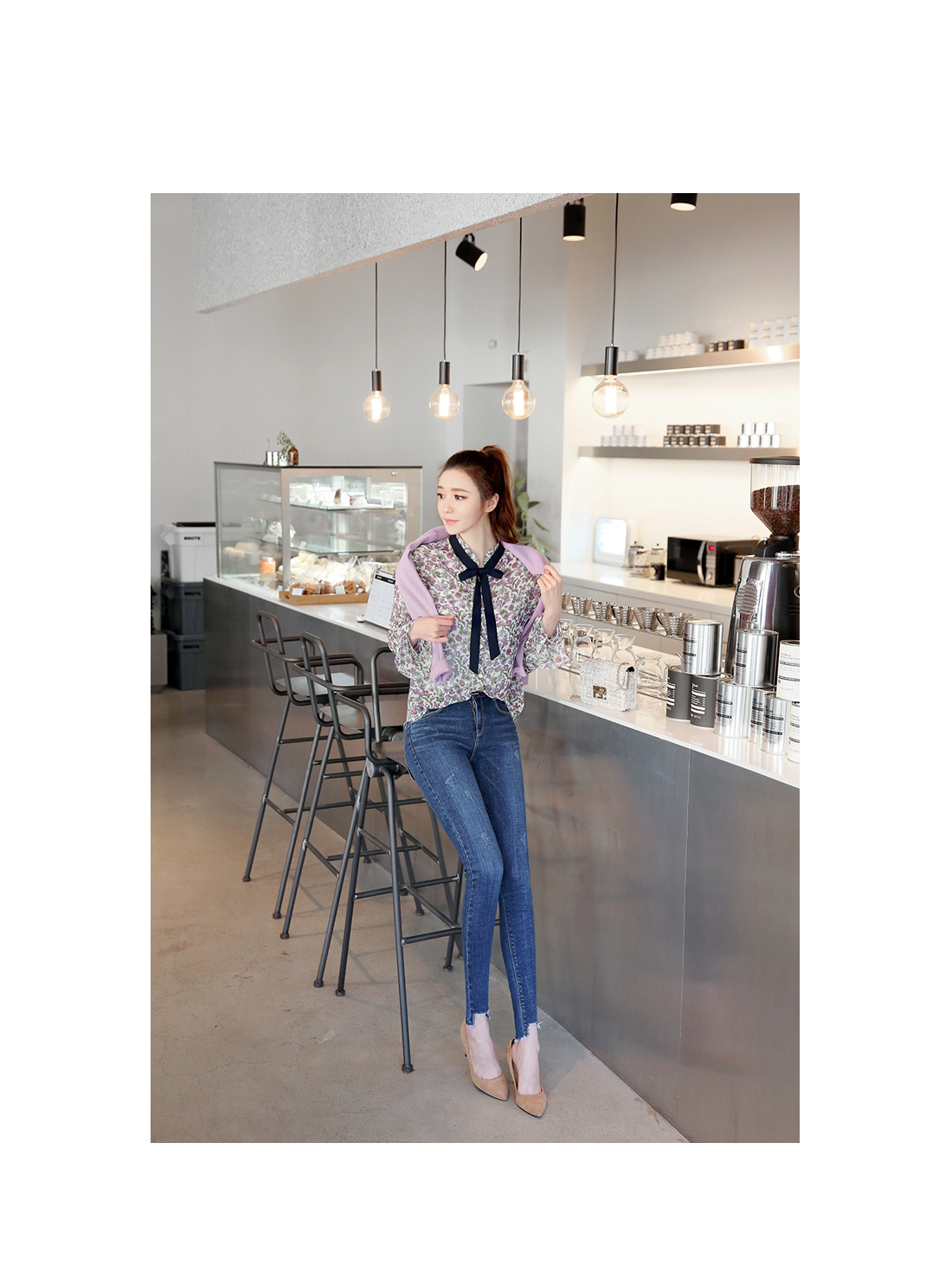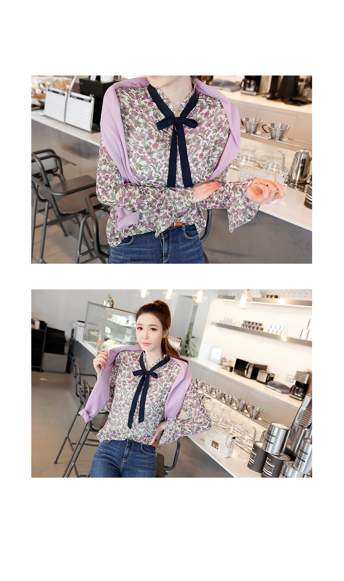 로맨틱한 무드의 쉬폰블라우에요! 은은한 플라워패턴과 소매 프릴이 로맨틱한 무드를 완성해 주구요 넥라인 리본끈이 포인트되어 한층 더 매력적인 룩을 완성해줘요~ 하늘하늘한 쉬폰 소재감으로 시즌에 상관없이 입을 수 있구요 과하지않은 스타일이라서 다양한 룩에 손쉽게 코디된답니다! 데님에는 물론 스커트에 매치하면 더욱 여성스럽게 연출할 수 있어요^^