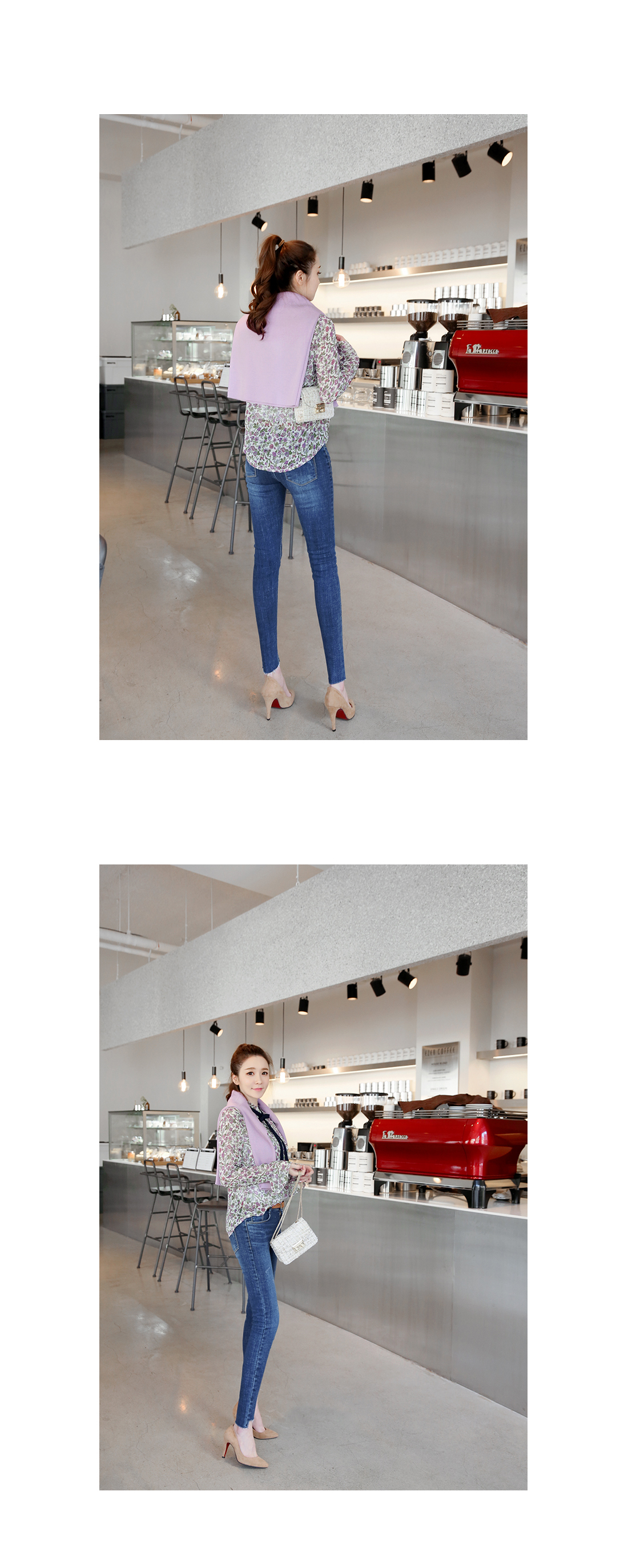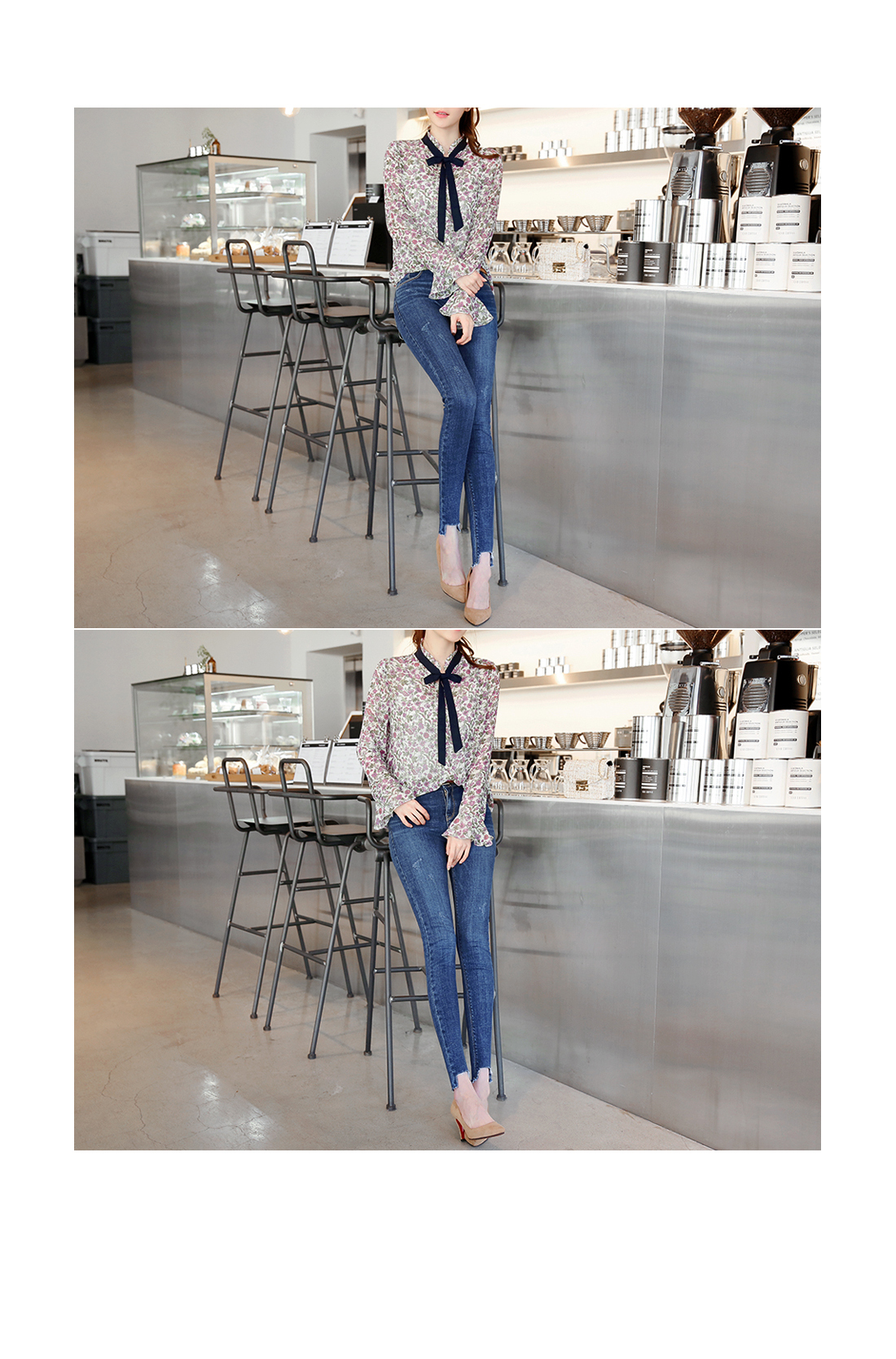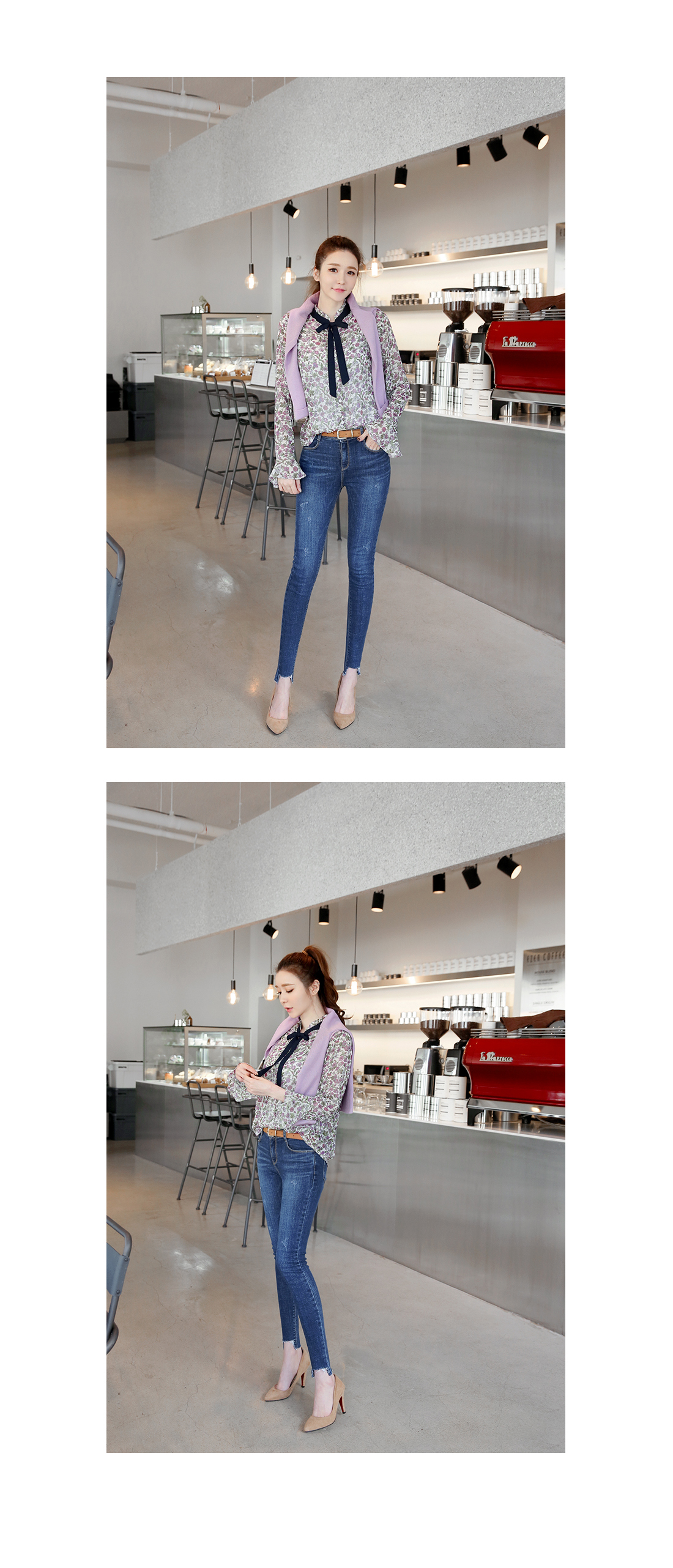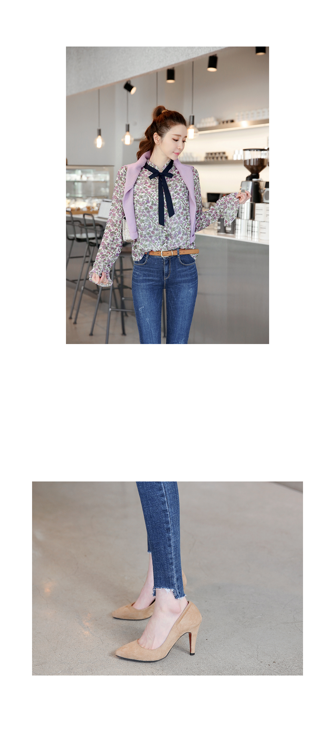로맨틱한 무드의 쉬폰블라우에요! 은은한 플라워패턴과 소매 프릴이 로맨틱한 무드를 완성해 주구요 넥라인 리본끈이 포인트되어 한층 더 매력적인 룩을 완성해줘요~ 하늘하늘한 쉬폰 소재감으로 시즌에 상관없이 입을 수 있구요 과하지않은 스타일이라서 다양한 룩에 손쉽게 코디된답니다! 데님에는 물론 스커트에 매치하면 더욱 여성스럽게 연출할 수 있어요^^