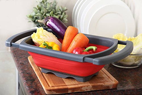 Features: Convenient Capacity--The Colander can easily hold up to 6 quarts of beans, berries, pasta, grains, fruits or vegetables. Space saving design--The food strainer length 15.5 inches and width 10 inches, Collapsed strainers is 1.6 inches high. so you can place neatly when you finished Non-Slip Handles--Go ahead and give this Colander a firm shake! The soft, comfortable handles help it stay in your hands, even when wet. Faster Draining--rounded holes draw water away from food, speeding up the straining process