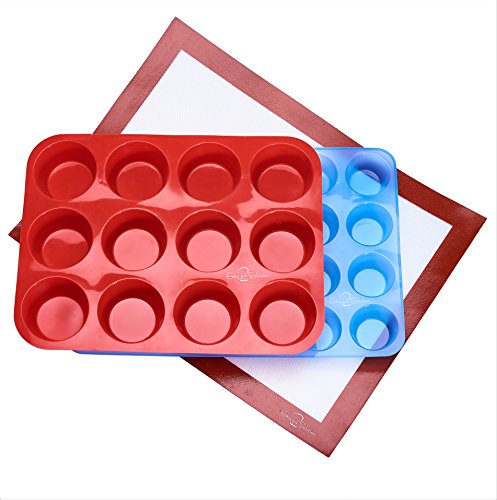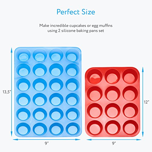 - PERFECT SILICONE BAKE SET – Make incredible cupcakes or egg muffins using 2 silicone baking pans set, and use the silicone baking mat as a liner in pans, for baking cookies, microwaving veggies, or for rolling out pie dough or pastries! The silicone cupcake baking set consists of 1 large cupcake silicone pan (13.15” x 8.86”) that can bake 24 Mini muffins, and another small silicone cupcake pan (11.65” x 8.86”) that can bake 12 Regular Size Muffins to help you meet gamut of needs.