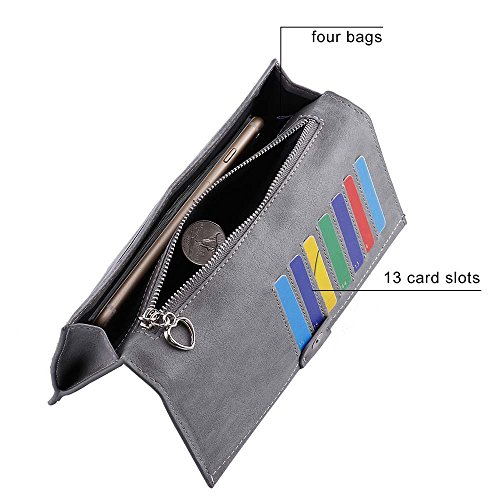 - Large Capacity: 13 card slots, 1 zipper coin pocket, 2 note slots, 1 large compartment for cash and 5.5 inch cell phone like iphone 7/8 plus etc.