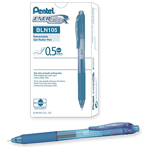 Pentel EnerGel-X Retractable Liquid Gel Pen (0.5mm) Needle Tip, Fine Line, Sky Blue Ink, Box of 12 (BLN105-S)