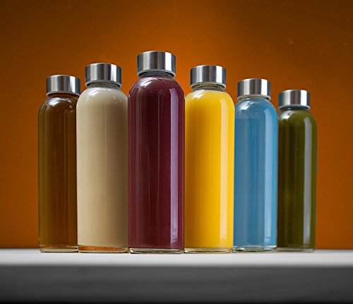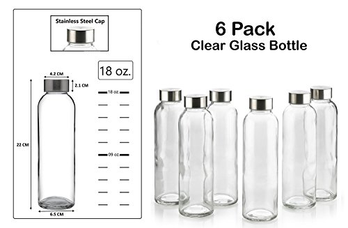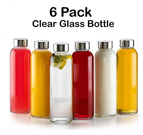 18 Oz Glass Water Bottle - 6 Pack With Stainless Steel Caps - For Beverage and Juicer Use - Best Reusable Sports Drinking Bottles for Fresh Juices, Juicing, Tea & Bulk Beverages – By Katzco