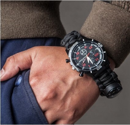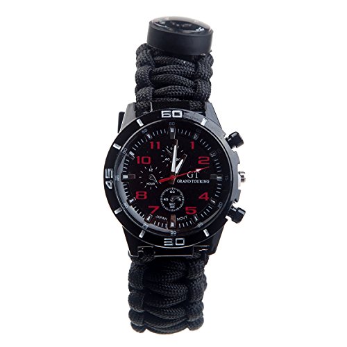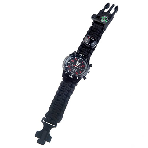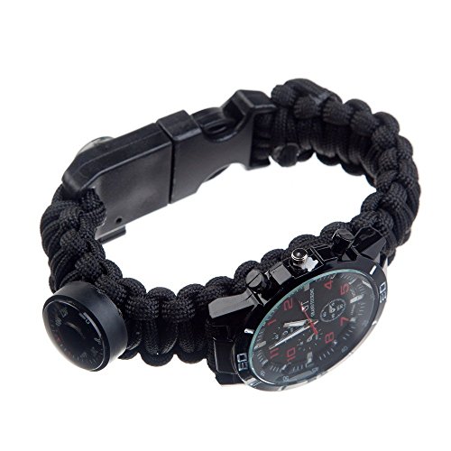 -. Feature : Highest quality Survival Gear - Handbraided paracord watch - patent pending. / 550-lb Military Grade Paracord Band - Fit wrist Sizes 7 -10 inches. / 7 in 1 Survival Watch - Include thermometer, compass, magnesium Flint-Rod firestarter, cutter, 150db whistle, analog clock, and paracord. Perfect emergency preparedness for camping, boating, hunting, hiking, fishing, ect. / Latest Tactical Watch - 2016 New watch face design, all parts are tested professionally. / Best Wearable Tactical Gear - A must have gift for survivalist, outdoor and nature lovers.