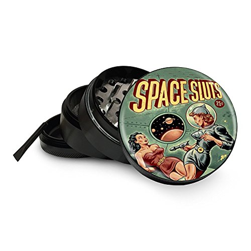 Space Sluts Grinder 4 Piece Premium Black Aluminum Aerospace Metal Grinders 2.5" 63mm - Easily Grind Herbs and Spices! Sci-fi Alien Pin Up Girl - Gift Box