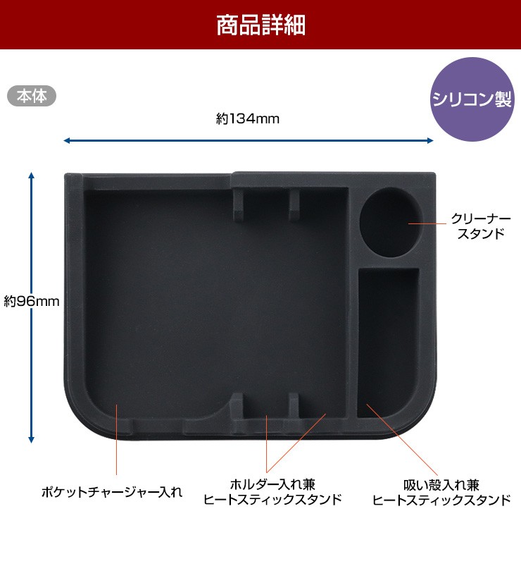 IQOS一式とヒートスティックが入れられる オールインワン 卓上トレイ商品仕様商品名:IQOS アイコス オールインワン 卓上 トレイ型番:3R-IQT01重さ:約85gサイズ:約24*134*96mm素材:シリコン保証期間:初期不良のみ注意事項:※平らな面でご利用ください。デジキン
