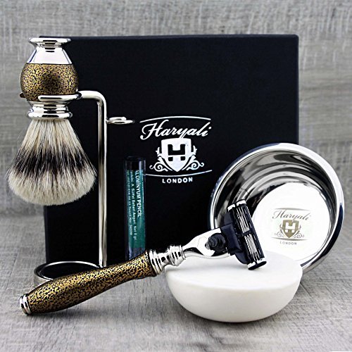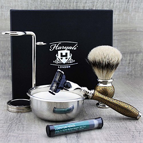 Complete Vintage Style Shaving Set for Men >Silver Tip Badger Brush, Gillette Mach3, Dual Stand, Engraved Bowl & Soap