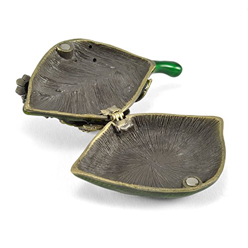 - Lavishly bejeweled frogs and flowers on enameled pewter leaf