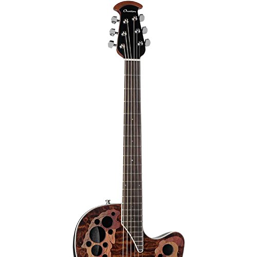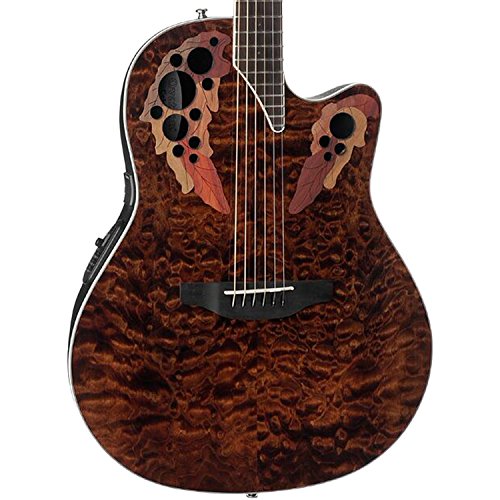 Studio : Ovation Guitars Publisher : Ovation Guitars Binding : Electronics Product Description The Celebrity Elite Plus series builds on the classic multi-sound hole instrument design of the Celebrity Elite guitars, upgrading them with select figured tops, beautiful abalone appointments and first-rate sound, style and features. The Celebrity Elite Plus CE44P-TGE guitar has the classic Mid Depth Lyrachord cutaway body with a Quilted Maple Top. This top features the Elite multi-soundhole design, which provides clear highs, focused, and balanced bass response. For the top’s quartersawn scalloped “X” bracing, we reviewed earlier Ovation bracing patterns extensively and arrived at a remarkable new design that borrows from the past and is voiced for the present. With natural tone and optimal response and power, the body, top and sound holes create the classic Ovation Elite sound, resonating with full projection, remarkable note clarity and balance, and nuanced tonal complexity. The top is complete with white binding and a beautiful transparent Tiger Eye finish. Other premium features include an effortlessly playable satin-finish neck, 10”-radius rosewood fret board with 20 fully accessible frets (24 frets for high E string), Pearloid inlays, and a rosewood bridge. The CE44P-TGE features an Ovation Slimline pickup and OP-4BT preamp system with three-band EQ, volume/gain control, onboard tuner and low-battery light. 0