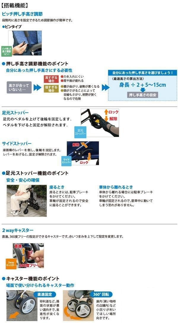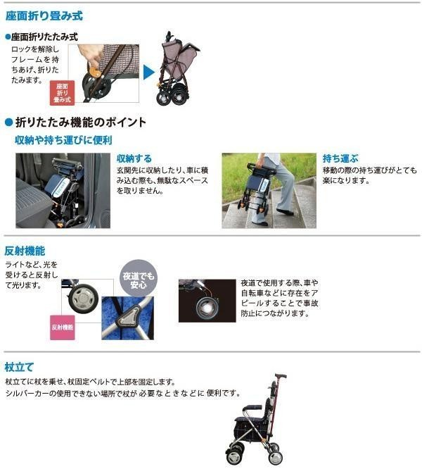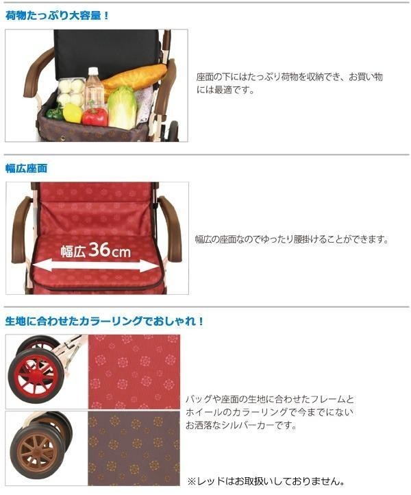 座面下の大容量収納、大きな前輪と幅広の後輪による安定性、長時間座っていても疲れにくい広々座面が特徴のスタンダードタイプのシルバーカーです。毎日のお買い物や、お出かけの時に最適です。 |