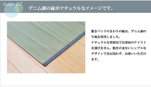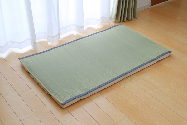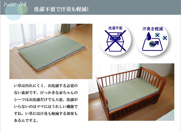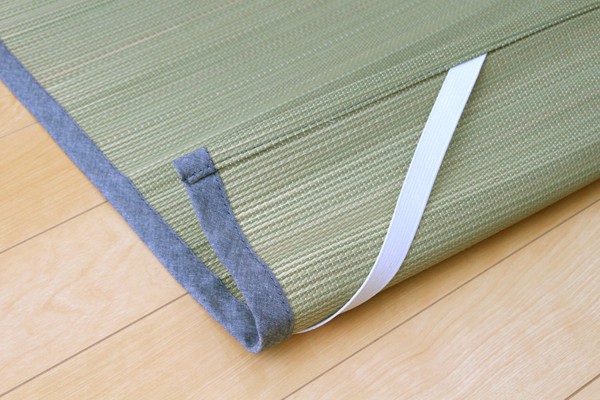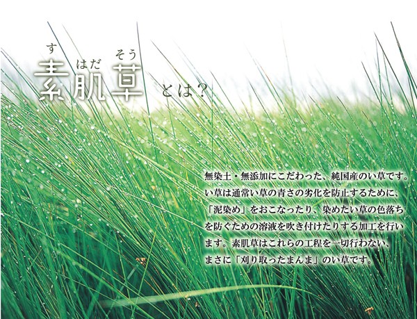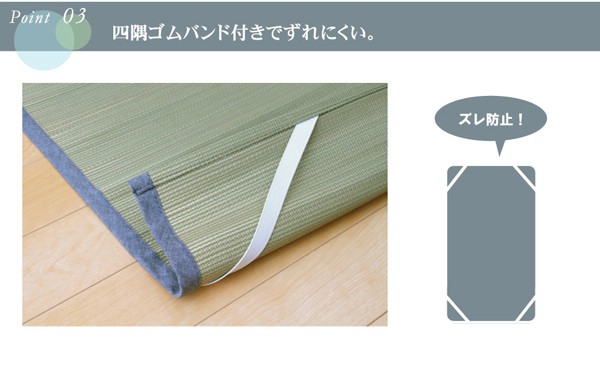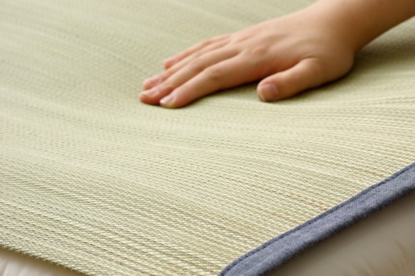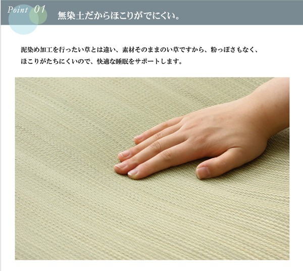 長時間、肌に接する寝具だからこそ、自然素材を使い、やわらかな質感にこだわりました。快眠い草の効能として1.綿の3倍の吸湿力 2.蒸れにくい。汗による湿気を吸うことにより温度を下げ快適な就寝を促します。 3.汗のにおいを軽減。汗のにおいの元となる化学物質を90%以上抑えます。などがあります。染料、染土を使わない国産(九州産)のしなやかなイ草を使用していますので、柔らかく、すべすべとしており身体にフィットします。裏面には四隅にゴムバンドが付いています。