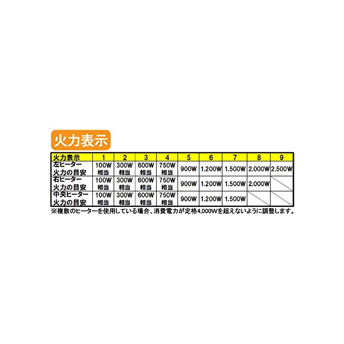 화력 조정좌 히터:튀김 조리…6단계(150~200℃)고, 가열 조리…9단계(약100W상당~약2500W) 중앙 히터:가열 조리:7단계(약100W상당~약1500W) 우히터:가열 조리…8단계(약100W상당~약2000W) 전원 코드 길이:약0.8m(3심 캡 타이어 코드)