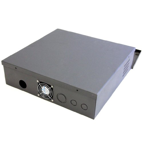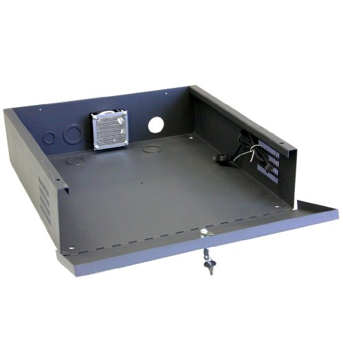 DVR Lockbox 18 X 18 X 5 DVR Lockbox with cooling fan: Made of super strong 16 gauge steel with removable lid for easy access, locking front door with cam lock and 2 keys, air vents, cooling fan and power cord for superior cooling, rubber bumpers and durable textured powdercoat finish. This lock box fits our Elite Mini DVRs. Please visit our Amazon store to find a Vertical or Horizontal mounting bracket.Feature