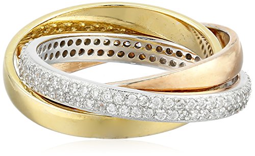-. Feature : Ring featuring three interlocking bands in rose and gold tones and cubic zirconia-studded sterling silver / Imported