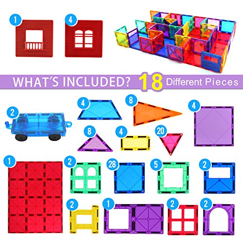 Let your kids unleash their wild imagination and ideas with children hub's magnetic toys why choose children hub? We care about your child's development: These popular building toys encourage imaginative and creative play, enhance math, geometry, and science skills. We make things easy for your kids: This magnetic blocks set is made with superior, bigger magnets compared to similar toys in the market. Bigger magnets means guaranteed durability and strong hold so kids can assemble them easily. We maintain the elegant appearance of our toys: Since these tiles are prone to scratches which usually happens during shipping, we raised the edges of our magnetic tiles to avoid this problem we care about your budget: This magnetic toy set is cost-efficient. High-quality tiles at a reasonable price. What's included? • 1 pc. Window sill • 4 pcs. Windows • 2 pcs. Wheel set • 4 pcs. Trapezoid • 8 pcs. Long isosceles triangles • 8 pcs. Small isosceles triangles • 4 pcs. Rectangles • 20 pcs. Equilateral triangles • 4 pcs. Big squares • 1 pc. Large tray • 2 pcs. Arched frames • 28 pcs. Small squares 5 pcs. Big hollow squares • 2 pcs. Small hollow squares •2 pcs. Barriers • 1 pc. Small hollow rectangle • 2 pcs. Cross frames • 2 pcs. Arched hollow squares.Feature