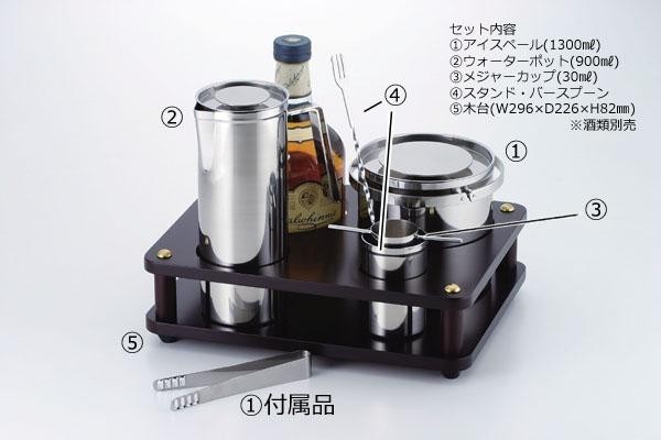 | セット内容 | アイスペール(1300ml) ウォーターポット(900ml) メジャーカップ(30ml) スタンド・バースプーン 木台(W296×D226×H82mm) |