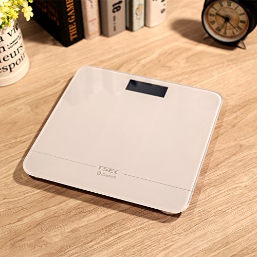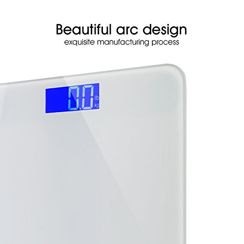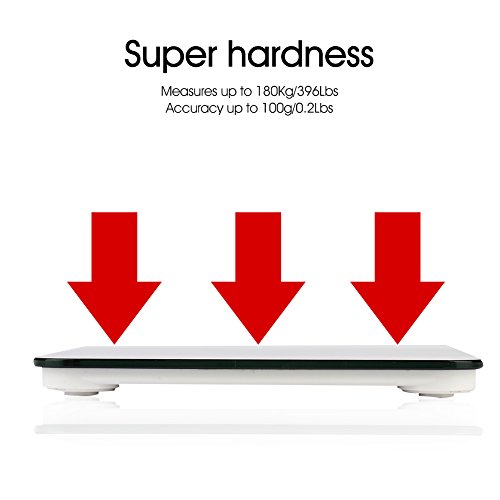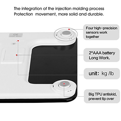 -. Feature : Perfect Design- Great look! Sharp, modern, and super shiny glass,slick look.Special ivory white color, it is very beautiful.You will like it / Fully Aware Of Your Health Date- BMI (Body Mass Index), body fat mass, lean mass, bone mass, total body water. Through bluetooth 4.0 technology with this bathroom sacles to your phone instantly.10 Precision Body Measurements / Ease Of Read - Read your body weight on a 2.3 blue backlit LCD display as soon as you step on the digital body weight scale / Accurate And Safe: Within 0.2 lbs, Up to 400 lbs.kg-lb,so easy;4 G-Sensors supports high precision body weight measurement;Scale adopt integrated process, high-end product.16 years of professional experience in the production of digital bathroom scales / Long Time Working - 2aaa batteries, turn off automatically, long time standby