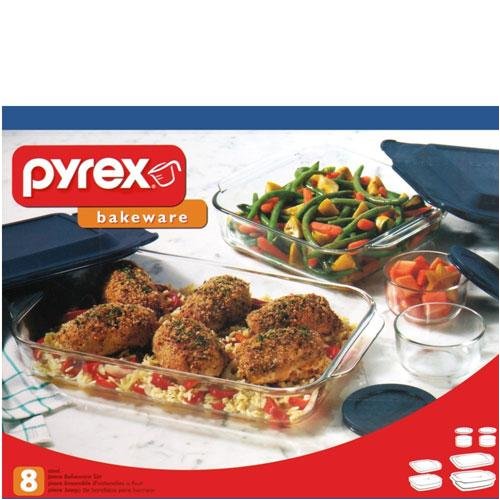 - 8-pc Bakeware Set includes one each: 3-qt Oblong Baking Dish, 8 Square; two each: 1-cup Round