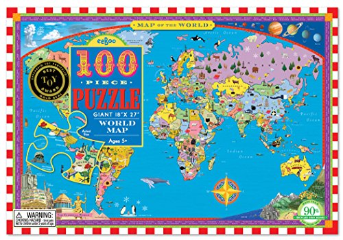 -. Binding : Toy -. Brand : eeBoo -. EAN : 0689196504150 -. Feature : Teaches You Geography as You Play! / Winner of the Oppenheim Best Toy Award! / Illustrated by acclaimed children's book illustrator, Dan Yaccarino. / Made of 90% Recycled Greyboard. / Icons on puzzle teach children about key wildlife and industry in each country! -. IsAdultProduct : 0 -. Label : eeBoo -. Manufacturer : eeBoo -. Model : PZWR2 -. MPN : PZWR2 -. PackageQuantity : 1 -. PartNumber : PZWR2 -. ProductGroup : Toy -. ProductTypeName : TOYS_AND_GAMES -. Publisher : eeBoo -. Studio : eeBoo -. Title : World Map 100 Piece Puzzle -. UPC : 689196504150