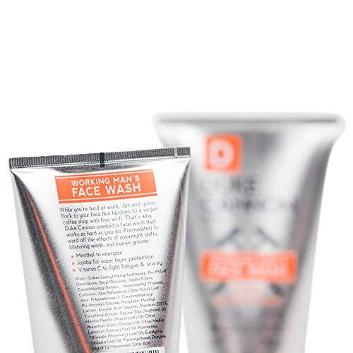 -. Binding : Misc. -. Brand : Duke Cannon -. EAN : 0711717793191 -. Feature : You will receive (1) Duke Cannon's Working Man's Face Wash, 4 ounces / Made with premium ingredients: Jojoba, Menthol & Vitamin C / Refreshing Citrus scent with a little grit for optimal cleansing / A portion of proceeds benefits US Veterans / Made In USA -. Label : DUKE CANNON SUPPLY CO. -. Manufacturer : DUKE CANNON SUPPLY CO. -. MPN : FW -. NumberOfItems : 1 -. PackageQuantity : 1 -. PartNumber : FW -. ProductGroup : Beauty -. ProductTypeName : BEAUTY -. Publisher : DUKE CANNON SUPPLY CO. -. Size : 4 Ounces -. Studio : DUKE CANNON SUPPLY CO. -. Title : Duke Cannon - Working Man's Face Wash -. UPC : 711717793191