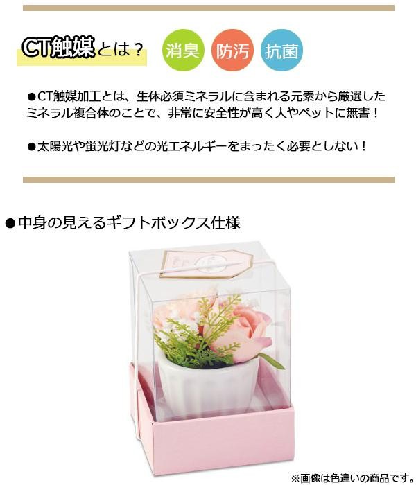アーティフィシャルフラワーはCT触媒加工が施されているので、置いておくだけで「消臭」、「防汚」、「抗菌」の効果があります。華やかな中にもピュアな雰囲気を兼ね備えた上品なバラのアレンジメントは、贈り物にも最適です。 |