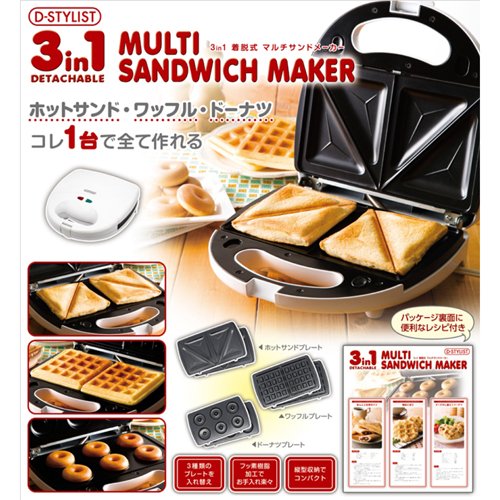 ●핫 샌드와플도너츠가 코레1대로 모두 만들 수 있다!●≪특징≫●3종류의 플레이트를 바꿔 넣을 수 있고, 불소 수지 가공으로 손질 악?.●종형 수납에 콤팩트.●≪사양≫●전원:AC100V●소비전력:750W●전원 코드:약70cm●온도 퓨즈:240℃●본체크기옆×(길이)깊이×높이(cm):23×23×8.5●질량(g):1400