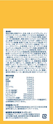 原材料:骨抜き鶏肉、乾燥チキン、玄米、大麦、エンドウでんぷん、エンドウマメ、オートミール、乾燥ニシン(オメガ-3脂肪酸源)、エンドウ繊維、エンドウタンパク、タンパク加水分解物、亜麻仁(オメガ-6脂肪酸源)、鶏脂(混合トコフェロールにて酸化防止)、乾燥トマトポマス、セルロースパウダー、乾燥アルファルファミール、馬鈴薯、乾燥チコリ根、アルファルファ抽出物、サツマイモ、人参、ガーリック、グルコサミン塩酸塩、ブルーベリー、クランベリー、大麦若葉、パセリ、ターメリック、乾燥ケルプ、ユッカ抽出物、コンドロイチン硫酸、乾燥酵母、乾燥エンテロコッカス・フェシウム発酵産物、乾燥ラクトバチルス・アシドフィルス発酵産物、乾燥黒麹菌発酵産物、乾燥トリコデルマ・ロンギブラキアタム発酵産物、乾燥バチルス・サブチルス発酵産物、ローズマリーオイル、アミノ酸類(DL-メチオニン、L-カルニチン、L-リジン、タウリン)、ミネラル類(塩化カリウム、第2リン酸カルシウム、炭酸カルシウム、食塩、亜鉛アミノ酸キレート、硫酸亜鉛、硫酸第一鉄、鉄アミノ酸キレート、硫酸銅、銅アミノ酸キレート、硫酸マンガン、マンガンアミノ酸キレート、ヨウ素酸カルシウム、亜セレン酸ナトリウム)、ビタミン類(塩化コリン、E、ナイアシン、パントテン酸カルシウム、L-アスコルビン酸-2-ポリリン酸、ビオチン、A、B1、B2、D3、B12、B6、葉酸)、着色料(野菜ジュース)、酸化防止剤(混合トコフェロール)