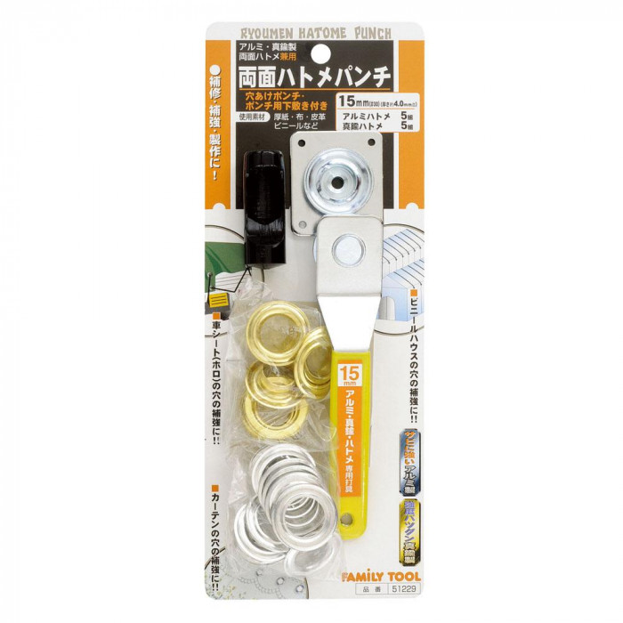 fk094igrjsシート、幌、テント、ビニールハウスの穴の補修や補強に厚紙・布・皮革・ビニール素材などにお使いいただけます サイズ 個装サイズ:3×25×10cm 重量 個装重量:260g 仕様 両面ハトメ15mm用(♯30) アルミハトメ×5組入り 真鍮ハトメ×5組入り 厚さ約4.0mmまで対応 製造国 日本 テントやシートの補修、補強に シート、幌、テント、ビニールハウスの穴の補修や補強に厚紙・布・皮革・ビニール素材などにお使いいただけます