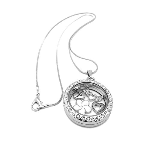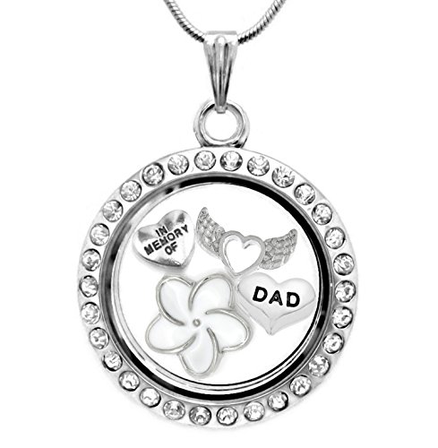 1 x 30mm Memory Locket Necklace With charms, including 18inch chain. Locket can be opened to add your own charms or small personal items . Charms included 'In Memory Of', 'Dad', white enamel flower and silver angel wings.Feature