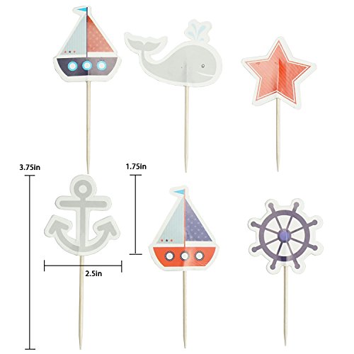 - ✈NAUTICAL CUPCAKE TOPPERS PACKAGE: Each package includes 24 pcs of cupcake toppers, 6 styles in total (blue sailboat, red sailboat, anchor, rudder, whale, stars),4 pcs each. Length about 3 inches, topper about 2.5 x 1.5 inches.