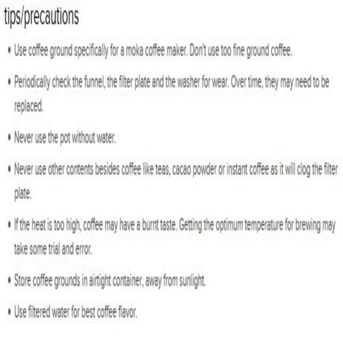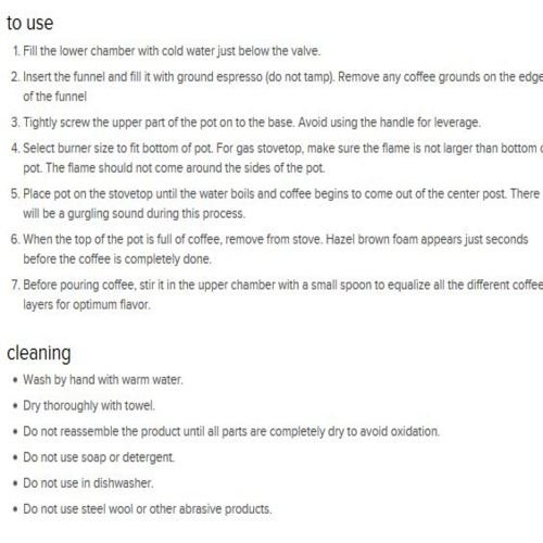Produces 6 cups of rich, velvety espresso in less than 5 minutes;Made of high quality polished aluminum;Max Boiler Capacity : 10(fl oz), 300ml;Easy to clean and disassemble;2 year warranty,Made in Europe