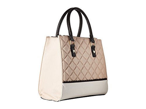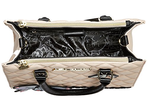Carry everything you need in style this with this adorable 3 Compartment Tote bag from Betsey Johnson. Made of PVC faux leather, Purse features Exterior Diamond Quilt, bottom trim and Betsey Johnson signature plate, 3-D Butterfly Making it fun and flirty. Gold color hardware, Double top handles with 6 drop, includes detachable adjustable cross-body strap with 25 drop, allows it being carried over your shoulder or hand. 2 Top zipper compartments and center pocket with magnetic closure opens to fully lined interior with 2 back wall slip pockets and 1 zipper pocket, It Brightens up your outfit with a pop of personality.Feature