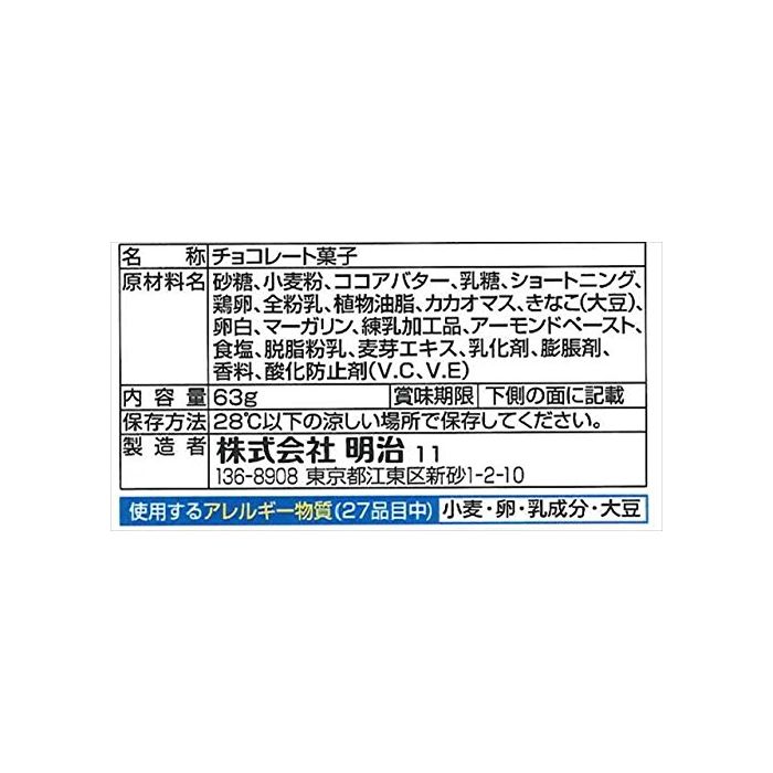 원재료:설탕,소맥분,코코아 버터,유당,쇼트닝,계란,전분유,식물성 기름지,카카오 마스,콩가루(대두)고, 계란 흰자,마가린,연유 가공품,아몬드 Paste,식염,탈지분유,맥아 엑기스,유화 제,팽창 제,향료,산화 방지제(V.C,V.E)