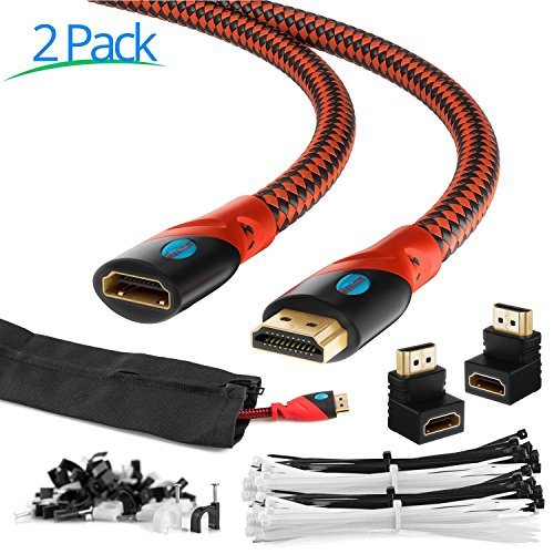 MAXIMM HDMI Male To Female Extension Cable 10FT 2PK For Ethernet 3D 4K Audio Return Blu-Ray Playstation XBox Streaming Jacketed Shielded Cables Cable Sleeve Ties Clips 90 & 270 Degree Adapter Included