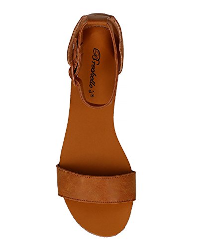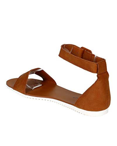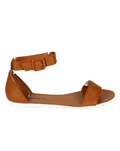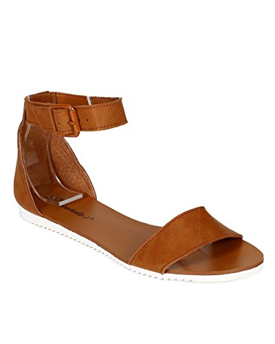 Breckelles CA52 Women Leatherette Open Toe Ankle Strap Flat Sandal - Tan
