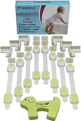 Baby Proofing Cabinets by BebeSpace , Child Proof Cabinet Locks, Baby Proof Safety Locks , Adjustable Latches (25 pack), 10 Baby Outlet Plug Covers, 8 Cabinet Locks, 6 Corner Guards, 1 Door Stopper