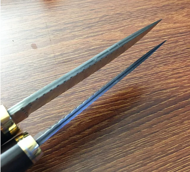상품 내용 전체 길이: 210 미리메터 블레이드 길이: 95 미리메터 핸들 길이: 120 미리메터 블레이드 폭: 28 미리메터 블레이드 두께: 4 미리메터 블레이드 재질: 다마스커스 스틸 무게: 220 그램 (포장) 경도: 59 HRC 표면: 다마스커스 단조 핸들 재질: 구리 헤드 + EbonyWood 감사합니다! 포장 상세