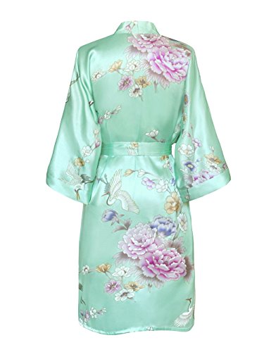 Old Shanghai Women's Kimono Short Robe - Chrysanthemum & Crane - Aqua