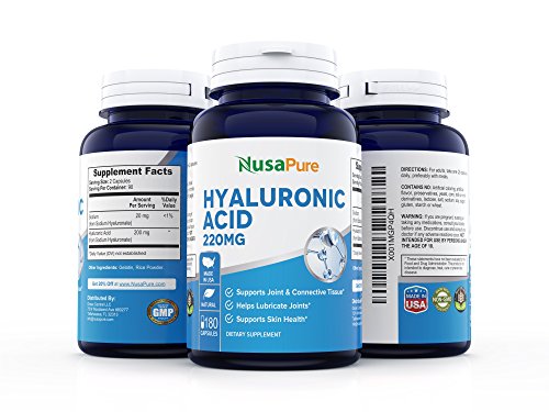 Hyaluronic acid is a natural substance produced by the human body.?It?is present in every tissue of the body, with the highest concentrations occurring in connective tissues such as skin and cartilage.?Hyaluronic Acid is known to hold up to 1000 times?its?weight in water.?Unfortunately, the amount of hyaluronic acid in body diminishes with age, leaving us with aching stiff joints and a?dried-out?skin structure that beneath the surface is damaged and on the?surface,?is visible as?fine lines.?Increasing natural levels of hyaluronic acid in the body may help to provide benefits for the joints, connective tissue and skin.?*?One of the easiest ways to reap the benefits of hyaluronic acid is with oral hyaluronic acid supplements.?Every capsule of NusaPure Hyaluronic Acid dietary supplement provides an optimum dosage 220 mg per Serving making it easy to distribute your dosage through the day to reach the correct recommended dosage.