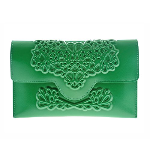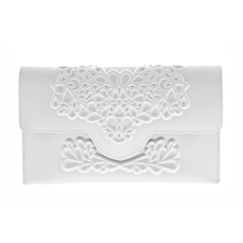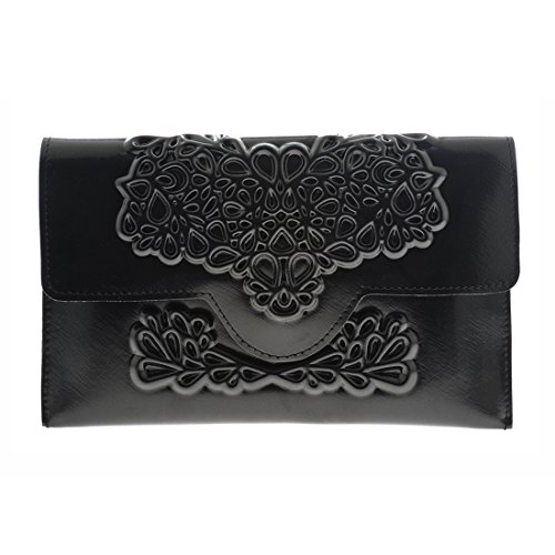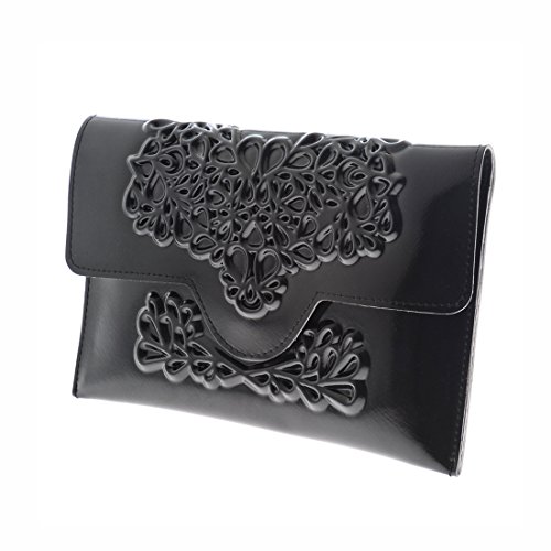 Our black vinyl clutch is vegan, eco-friendly, and cruelty-free. This embossed vegan leather clutch purse has a revolutionary floral print that is appropriate for days and evenings. It is slim in size and huge in presence. Imagine yourself on your next date night making a fashion statement with this edgy contemporary clutch. It is ideally sized for stowing a cell phone and other small essentials. It contains an inner pocket with a zipper for your credit cards, drivers license, and cash. This slim evening clutch bag is a fold-over design with a magnetic closer ideal for holding your evening essentials. It is easy to clean. Just wipe the surface with a wet cloth or use a soft brush to gently clean between the creases of the pattern to make your clutch look brand new. Our vegan slim evening clutch is a sophisticated solution for replacing a large bag while on a dinner date, at a wedding or other event. Dimensions: Width: 9.5 inches (24 centimeters) Height: 6 inches (15 centimeters) Depth: 0.8 inches (2 centimeters)Feature