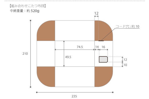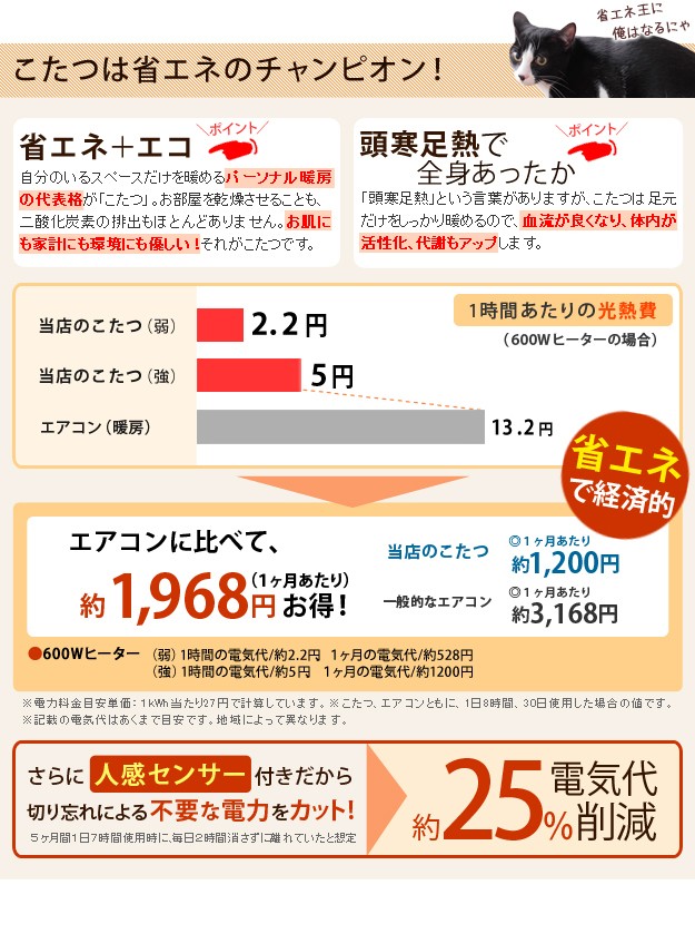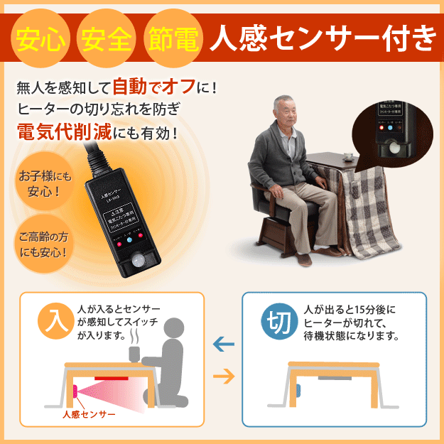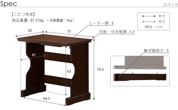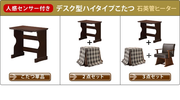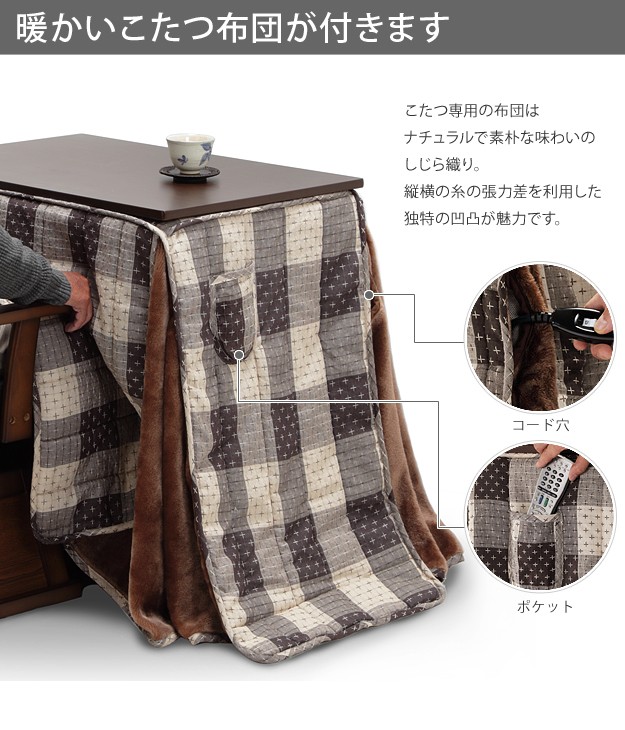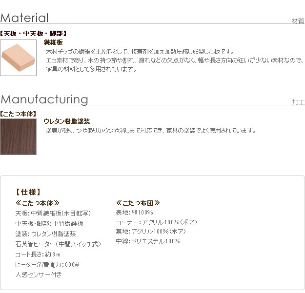 ※メーカー直送のため代金引換はお受けできません。※沖縄・一部離島は別途送料がかかります。お見積もりいたしますのでお問い合わせ下さい。セット内容:こたつx1台、こたつ布団x1枚【人感センサー付】薄型石英管ヒーター(600W・中間スイッチ式)、コード長3mサイズ(cm):こたつ-幅75x奥行50x高70.5・約21kg、布団-235x210カラー:こたつ-ブラウン、布団-しじら織り材質:天板-繊維板(木目転写)、脚部-繊維板、ウレタン樹脂塗装、布団表地-綿100%組立品株式会社ナカムラ(I-3300001)