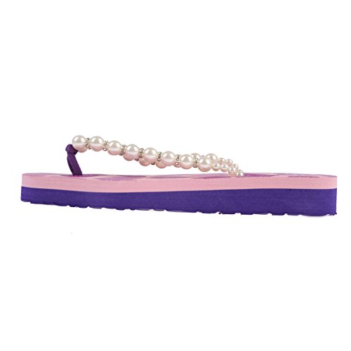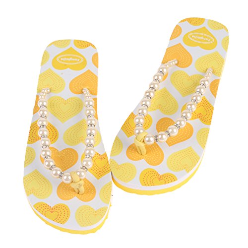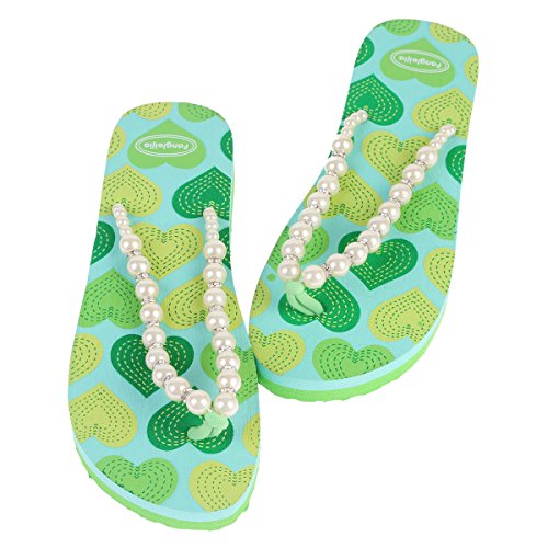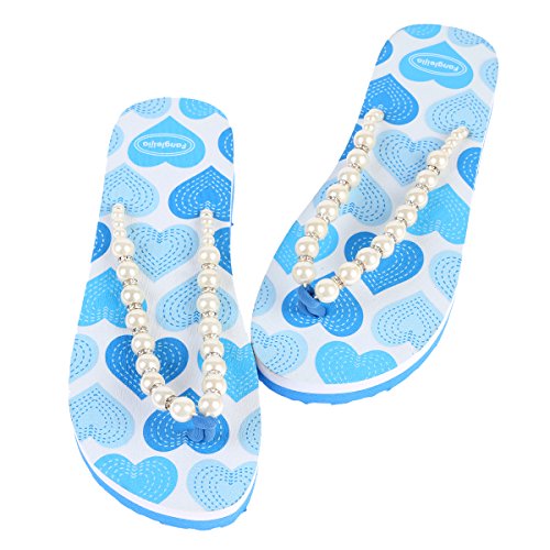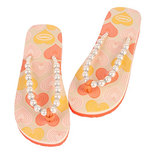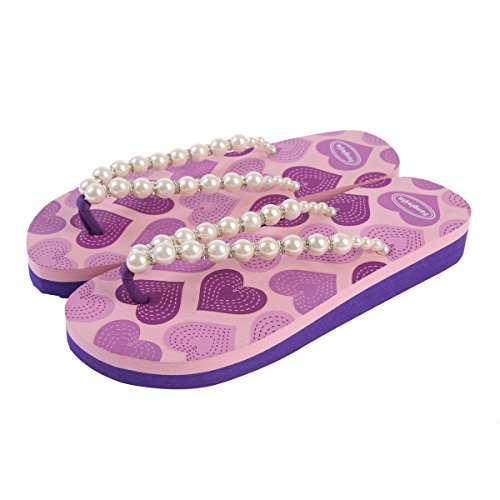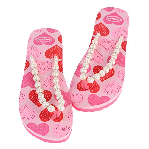 Binding : Apparel Product Description A pair of fashionable flip flops that are essential for summer! This pair of flip flops is made of EVA foam. This pair of flip flops has faux pearl beading straps that adorned with rhinestones on the top. The sole of the flip flops is covered with heart prints. The bottom of the shoes are in leopard-shaped uneven convexes that are for skid prevention. This pair of flip flops are in free size. Measurement: shoes length 24.5cm (9.5 inches); shoes width 9.5cm (3.7 inches); heels height 3cm (1.1 inches). 0
