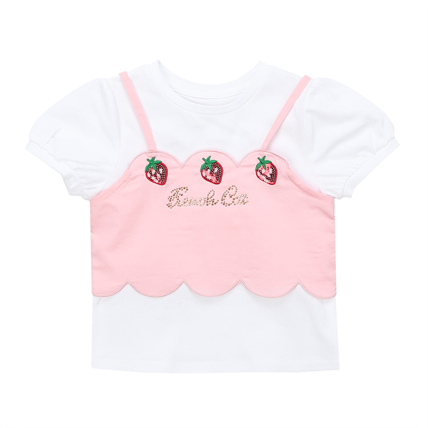 상세설명-핑크 딸기 뷔스티에 티셔츠입니다. 레이어드 룩이 용이하게 베스트 스타일과 베이직한 티셔츠로 구성이 되었습니다. 스칼랩 라인에 따라 들어간 스팽글 딸기로 큐트한 느낌을 더해 주었습니다.