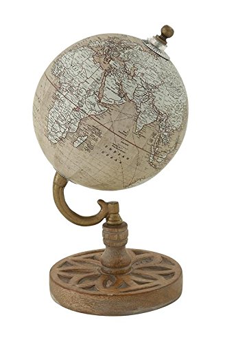 Studio : UMA Enterprises Publisher : UMA Enterprises Binding : Kitchen Product Description 5 inch updated traditional vintage home decor globe with an aged washed colored PVC globe featuring fine detailed drawings of the world held up by a curved hook sitting on a wooden wheel stand with detail floral carvings. This product is manufactured in India. 0