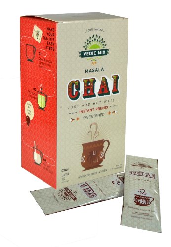 -. Binding : Misc. -. Brand : Vedic Mix -. Color : Reddish Brown -. EAN : 0045635273122 -. Feature : GMO Free / 100% Natural / For anywhere on the go, home, office, events or Café. / Guaranteed Satisfaction / Authentic Indian Taste. -. Label : Vedic Mix -. LegalDisclaimer : Actual product packaging and materials may contain more and different information than what is shown on our website. We recommend that you do not rely solely on the information presented and that you always read labels, warnings, and directions before using or consuming a product. -. Manufacturer : Vedic Mix -. NumberOfItems : 1 -. PackageQuantity : 10 -. ProductGroup : Grocery -. ProductTypeName : GROCERY -. Publisher : Vedic Mix -. Size : 220 gm -. Studio : Vedic Mix -. Title : Vedic Mix Masala Chai Tea Latte - Sweetened -. UPC : 045635273122
